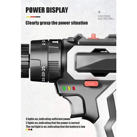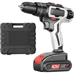 [Batterie et charge rapide] : perceuse sans fil avec batterie Li-ion 1 500 mAh, charge rapide en 1 heure. Pratique pour vous de remplacer les piles si l’une d’entre elles est morte. Lorsque la perceuse est activĂ©e, la lumière LED intĂ©grĂ©e illumine la surface de votre projet, augmentant la visibilitĂ© et vous permettant de travailler dans des conditions sombres (veuillez faire attention, dĂ©branchez la batterie lorsqu’elle est complètement chargĂ©e pour prolonger [2 vitesses] : changez facilement les embouts et alternez entre 2 sĂ©lections de vitesse (pour le forage et la conduite Ă haute et basse vitesse ; la 1ère vitesse fournit plus de couple et de contrĂ´le, la 2ème vitesse fournit plus de vitesse). [ERGONOMIE] : cet ensemble de perceuse sans fil 42 V vous offre un contrĂ´le de vitesse variable et un système de freinage de sĂ©curitĂ© Ă©lectrique unique. [Rechargeable] : les batteries lithium-ion fournissent une puissance de sortie Ă©levĂ©e et permettent un grand nombre de cycles de charge. L’action de changement rapide de la batterie Ă ressort vous permet de retirer rapidement la batterie.SpĂ©cifications : une batterie