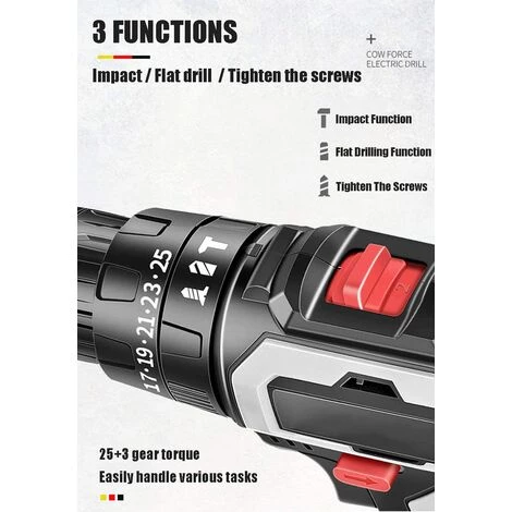 [ENSEMBLE DE VISSEUSES PUISSANTES] : perceuse sans fil 42 V avec 25 + 3 réglages de couple qui offre un contrôle précis pour le perçage dans la pierre, le bois, le métal, le plastique et toutes les tâches de tournevis. Ils vous suffisent pour faire la majeure partie du travail. La capacité de forage maximale est 50 mm pour le bois, 25 mm pour le ciment et 20 mm pour le métal.