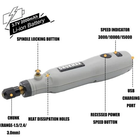 AJUSTEMENT DE VITESSE 3 VARIABLES – Équipé du modèle à 3 vitesses: 5000 tr / min, 10000 tr / min et 15 000 tr / min vous permet de régler la vitesse de rotation en fonction des différentes situations de travail de bricolage.