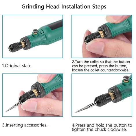 Selon différents forets, 24 accessoires aident à effectuer différentes tâches, telles que le perçage, le meulage, la gravure, etc., la taille du mandrin est de 3/32 « (2,3 mm)