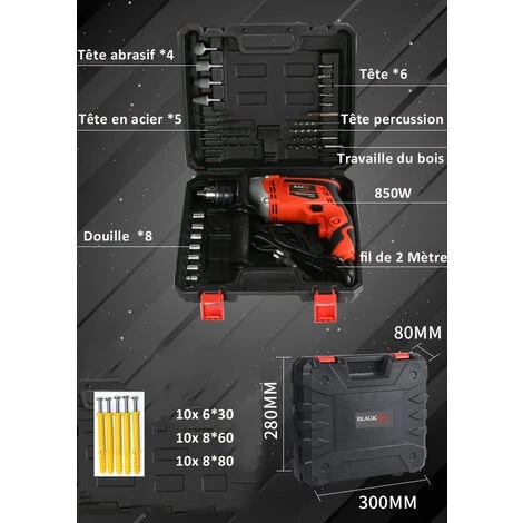 BLACKPINE vous propose Perceuse Percussion, 57pcs Kit d’accessoires, Perceuse à Percussion 850W 3000R/PM, Perforateur Taille de Mandrin 0-13mm. ACCESSOIRES RICHES – 4 x Tête abrasif, 5 x tête en acier fer, 6 x tête, 2 x tête percussion, 2 x tête pour travaille du bois, 8 x tête de douille, 10 x vis d’expansion 6*30, 10 x vis d’expansion 8*60, 10 x vis d’expansion 8*80. 850W HAUTE PUISSANCE & 1,98 KG :Le moteur puissant (850W) fournissent 30% de puissance en plus pour réaliser facilement le forage, poids léger (1,98kg), taille compacte(25*20*11cm), idéal pour la maison bricolage.
