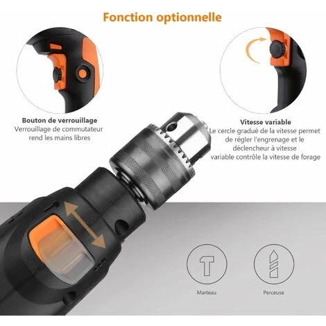 Le bouton pour sélectionner la fonction Perforateur et perceuse en fonction de votre tâche, convient pour percer des portes et des fenêtres, installer des lampes, des meubles de télévision, etc. 3000 RPM Vitesse Réglable – Vous pouvez régler la vitesse requise entre 0 et 3000tr/min en fonction de vos différents travaux. Démarre quand vous pressez le bouton. La vitesse s’augmente avec la pression plus forte. Le bouton de verrouillage vous permet de verrouiller la vitesse et d’enlever librement votre pour réduire la fatigue.