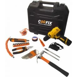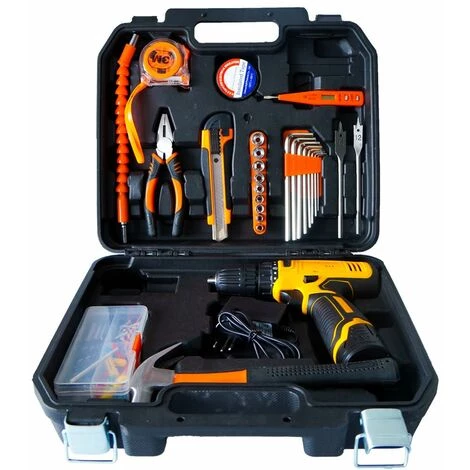 Outils Inclus:1 * boîtier en plastique1 * perceuse au lithium1 * pince combinée1 * marteau à griffes1 * ruban isolant8 * clé hexagonale1 * stylo électrique9 * douilles9 * embouts de tournevis1 * adaptateur de douilles1 * ruban à mesurer