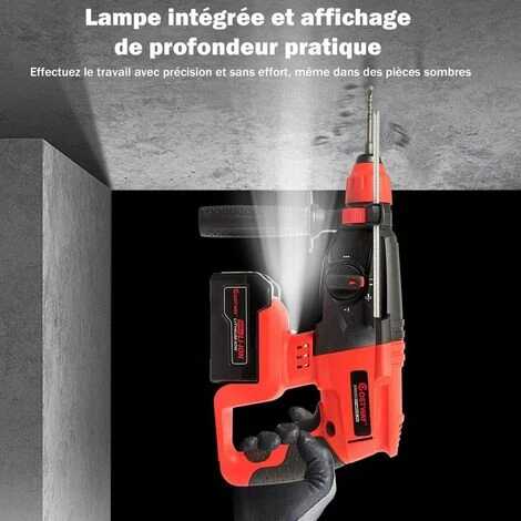 - 【Poignée tournante à 360°:】La poignée auxiliaire de notre marteau électrique a une excellente flexibilité pour pivoter sur 360 degrés avec un contrôle et un confort supplémentaire. La jauge de profondeur graduée détachable et la lampe intégrée unique vous permettent de travailler avec précision et commodément même dans l’obscurité.