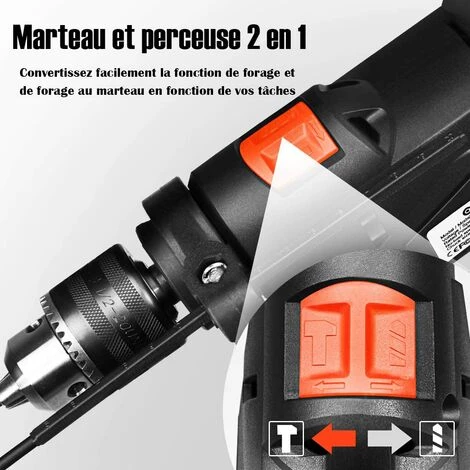 【Fonctions perceuse et marteau perforateur 2-en-1】Cette perceuse à fil comprend des fonctions de marteau perforateur et de perceuse, qui peuvent être facilement converties par un sélecteur à deux modes en fonction de vos tâches. Elle permet d’économiser plus d’efforts pour le forage du bois, de la maçonnerie, du métal, du béton et d’autres matériaux durs.