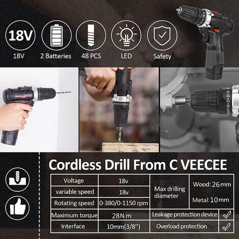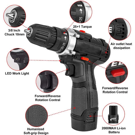 【Fonction puissante】 : perceuse à haute et basse vitesse (1 vitesse : 0-380 tr/min, 2 vitesses : 0-1150 tr/min, réglage du couple : 25 + 1. Peut contrôler le mode de travail dans le sens des aiguilles d’une montre ou dans le sens inverse des aiguilles d’une montre, c’est après avoir fixé la vis Facile à retirer ou à remplacer.La position médiane de la plaque de commutation peut jouer instantanément lorsque vous la mettez au repos.