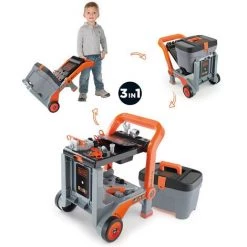 Le diable 3 en 1 Black + Decker est l’outil indispensable pour tous les bricoleurs en herbe, comme toi ! Très complet, tu auras à la fois 1 diable pour tout transporter, 1 établi, et 1 brouette ! Tu arriveras facilement à le transformer car il est très ergonomique ! Tu pourras aussi utiliser la boite à outils incluse seule grâce à sa poignée. 18 autres accessoires sont inclus pour des heures entières d’amusement : 3 outils (1 clé plate, 1 tournevis, 1 clé à pipe), 1 étau, 1 set de 6 planches de construction, 4 vis et 4 écrous. Tu pourras imiter papa et maman et t’entrainer à devenir un bricoleur professionnel ! Pour les enfants à partir de 3 ans. Made in France.