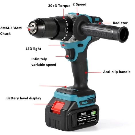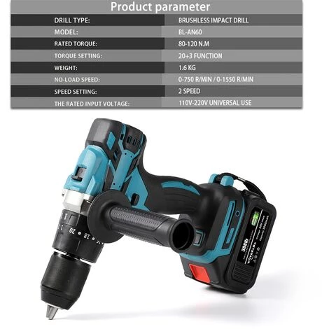 20V 13mm perceuse à percussion sans fil 20V 13mm perceuse à percussion sans brosse 20V perceuse à percussion 20V perceuse visseuse avec deux batteriesSpécification:Fonction: perceuse à percussion, perceuse à percussion, tournevis 3 en 1Source d’alimentation: DCTension: batterie cc au lithium-ion 20VVitesse à vide: 0-750/0-1350 tr/minCouple maximum: 80-120 NMEngrenage de couple: 1-20Vitesse d’impact: 2Application: acier/bois/bétonMax Diamètre De Perçage:Acier: 13mmBois: 38mmBéton: 14mmFréquence: 50-60HzType De moteur: BrushlessTaille du mandrin: 1.5mm-13mmBatterie compatible: 1830,1840,1850,1860…Marchandises dans le paquetUN:1 X corps de perceuse à percussion sans brosse sans fil1 X petite batterie1 X chargeurB:1 X corps de perceuse à percussion sans brosse sans fil2 X petite batterie1 X chargeurC:1 X corps de perceuse à percussion sans brosse sans fil1 X grosse batterie1 X chargeurD:1 X corps de perceuse à percussion sans brosse sans fil2 X grosse batterie1 X chargeur