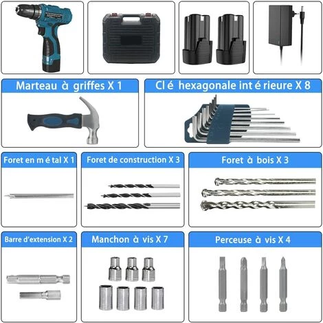 - 【Beau Emballage et Service Parfait】Ce kit de perceuse sans fil contient: 1*Perceuse sans fil, 1*Boîte à outils, 1*Marteau à griffes, 8*Clé hexagonale intérieure, 1*Foret en métal, 3*Foret de construction, 3*Foret à bois, 2*Barre d’extension, 7*Manchon à vis, 4*Perceuse à vis et 1*Manuel.