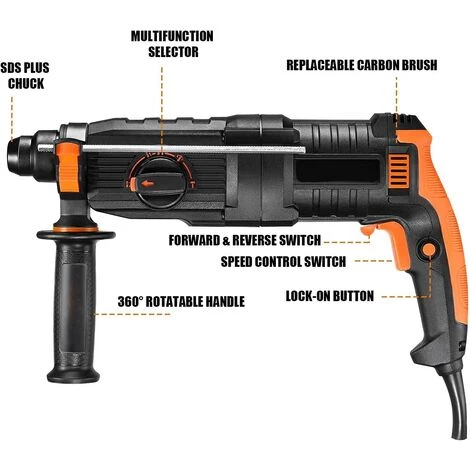 - CONTENU DU PAQUET: 1 * Marteau rotatif, 3 * Forets 6,8,10mm, 1 * Burin plat, 1 * Burin pointu, 1 * Mandrin de perçage SDS Plus, Couple brosses en carbone, Jauge de profondeur en métal, Poussière couverture, Etui portable, Manuel d’utilisation