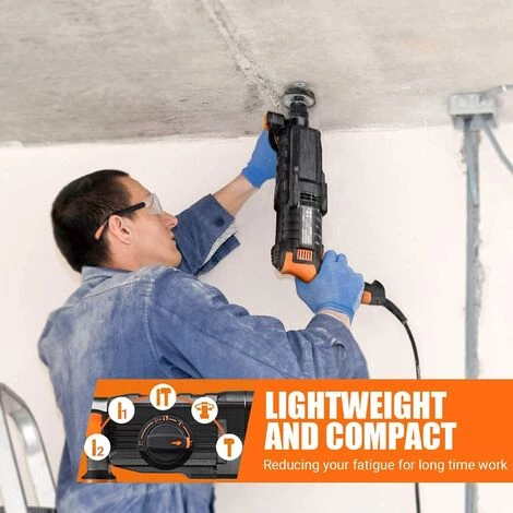 - INTERRUPTEUR ET BOUTON: Le marteau rotatif est doté d’un interrupteur régulateur de vitesse en continu. Vous pouvez vous rendre compte que la vitesse change librement maximale 3200RPM. Et appuyer sur le bouton de verrouillage permet à la machine de fonctionner à une vitesse constante pour économiser votre énergie