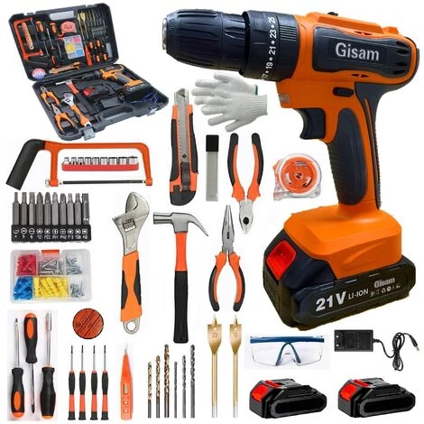 Ensemble d’outils électriques avec perceuse sans fil 21 V. Pour le perçage dans le bois, le métal et les plastiques, tandis que vous pouvez utiliser la gâchette à vitesse variable avant et arrière pour contrôler facilement les vitesses de perçage et inverser les forets, un bouton de verrouillage facilite le perçage en continu.