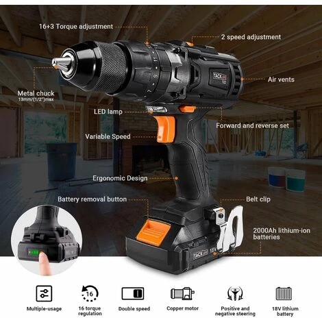 Conception ergonomique, prise en main confortable, très facile à contrôler et facile à manipuler dans les espaces restreints, alimentation par batterie au lithium 20V, deux vitesses de 450 tr/min à 1600 tr/min, couple maximal de 310 po.Lbs, lumières LED intégrées, équipées de perceuses et la tête de lot est équipée d’une batterie au lithium, qui peut être chargée rapidement en 1 heure.