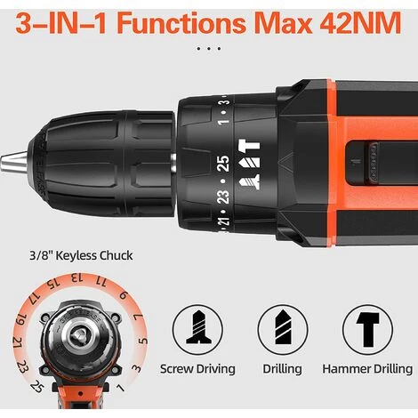 【Fonction 3-en-1 et couple maximal de 32 Nm】 Le tournevis pour perceuse dispose de 3 modes de fonctionnement: vissage, perçage et perçage à percussion, la fonction marteau, qui peut considérablement augmenter votre efficacité de travail. Avec un couple de 32Nm Max, la perceuse électrique peut facilement répondre à un large éventail de besoins de perçage de trous et de vis d’entraînement sur le bois, le métal et le plastique.