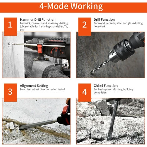 SĂ©lection de 4 modes — Cette perceuse Ă percussion comprend des paramètres d’alignement de perceuse, de perceuse Ă percussion, de burin et de burin 4 fonctions en 1 outil, Ă©conomie d’argent, gain de temps et efficacitĂ© accrue.