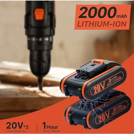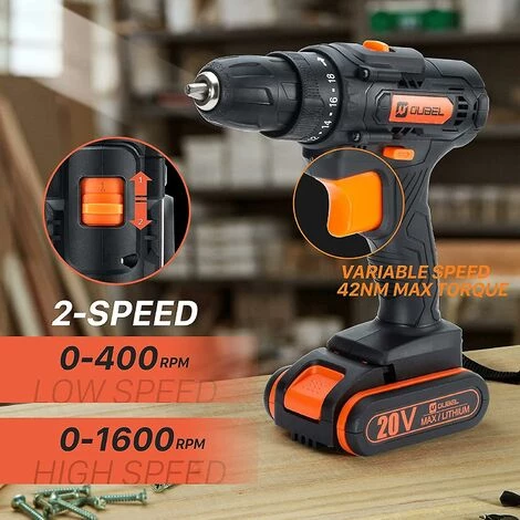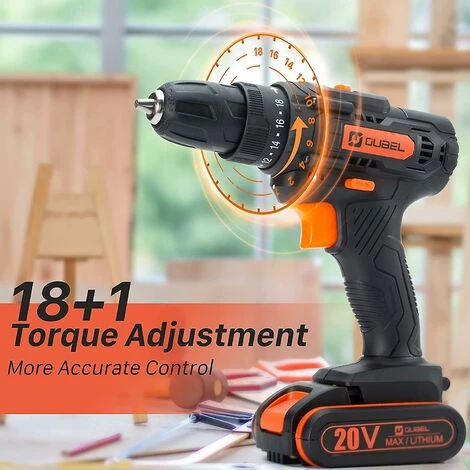 18 + 1 Couple Rglable: vous permet de contrler avec prcision la taille du trou pour rpondre vos diffrents besoins. Couple 42N.m. Pour percer les murs, le bois et le mtal, des visseuse devisseuse san fil avec des conditions de couple robustes et stables sont disponibles.Deux vitesses et deux directions: visseuse sans fil 2 vitesses 0-400/0-1600 tr/min, des directions diffrentes facilitent le forage et le vissage, Perceuse visseuse peut contrler le mode de fonctionnement dans le sens horaire / anti-horaire, ce qui est pratique pour le retirer ou le remplacer aprs le serrage de la vis. Lorsque la position de la carte est au milieu, visseuse sans fil est le mode sans chec.Conception Conviviale: clairage LED intgr, vous n’avez pas vous soucier de la lumire de l’environnement de travail. visseuse devisseuse san fil est facile transporter et utiliser avec sa petite taille et son poids lger.Accessoires complets: 1 * chargeur rapide, batterie 2 * 2000mAh, 1 * bote de transport, 2 * forets bche (10 / 12mm) 9 * cl douille (5/6/7/8/9/10/11/12 / 13mm ), 3 * forets hlicodaux (HSS5 / HSS6 / HSS8), 3 * forets pointe brad (5/6/8), 4 * embout de tournevis PH1 / PH2 / 4/5), 1 * adaptateur de douille, 1 * porte-tournevis hexagonal, 1 * tournevis flexible, 1 * manuel d’utilisation. Chargeur rapide: 190V-240V, environ 1 heure complte.OUBEL has excellent customer service and we have been specializing in the upgrade investigation of power tools. When you have any questions, please don’t hesitate to ask our customer service staff, we will give you a 100% satisfactory answer.