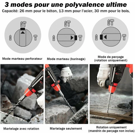 Présentation produit: Marteau perforateur electrique sans fil 960 tr/min 4260coups/min sds-plus à vitesse réglable avec 3 forets