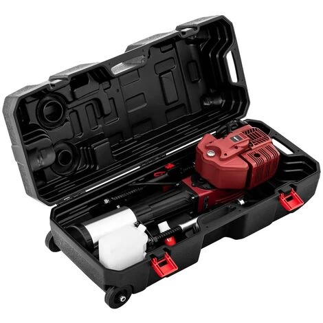Enfonce-pieux thermique; 3 adaptateurs pour pieux (49, 69, 100 mm); huile (60 g); bougie d’allumage Bm6a; clé à fourche, 8 – 10 mm; clés hexagonales M4, M5, M6, M10; clé à bougie; tournevis; clé hexagonale en T; bouteille d’huile pour le mélange; mallette à roulettes; manuel