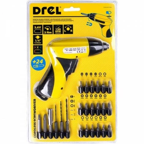 Tournevis sans fil Tournevis Tournevis 24 x embouts_x000D_Tournevis à batterie 3,6 V, 24 bits_x000D_Un petit tournevis sans fil pratique pour les travaux ménagers légers._x000D_L’ensemble comprend jusqu’à 24 éléments: 3 forets, une extension et 20 bits._x000D_Le tournevis a un indicateur de niveau de batterie._x000D_DESCRIPTION DU PRODUIT:_x000D_Tension de la batterie: 3,6 V_x000D_Vitesse de rotation: 0-150 tr / min_x000D_Couple maximum: 3 Nm_x000D_Capacité de la batterie: 1,3 Ah_x000D_Batterie: Lithium-ion_x000D_Temps de charge: 3-5 heures_x000D_Tension du chargeur: 220-230 V_x000D_L’ensemble comprend des embouts 24 pcs._x000D_Emballage: blister_x000D_Outils, outils de serrurier