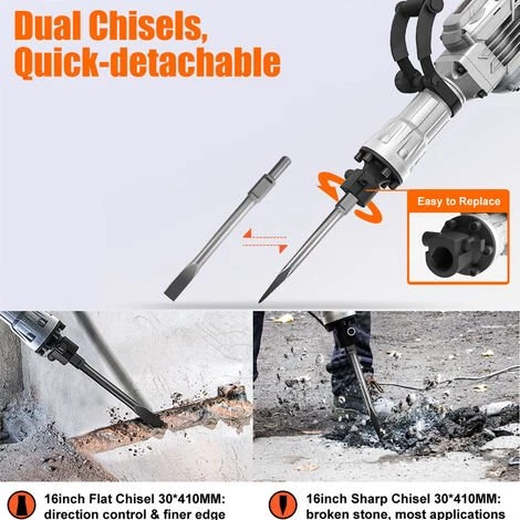 Donnez 2 000 coups par minute avec 44,3 pi-lb. de force d’impact à 39 livres. de poids, simplement pour briser la surface dure, comme le béton, la brique, la roche, la chaussée, etc.