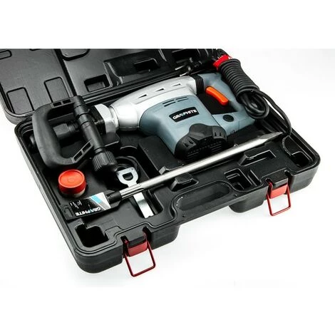 Marteau de démolition haut de gamme SDS MAX GRAPHITE (réf. 58G876) d’une puissance de 1200 W, conçu pour divers types de travaux d’installation et de démolition. Le marteau est sûr et confortable à utiliser grâce à la poignée principale recouverte d’un matériau antidérapant et à la poignée supplémentaire qui vous permet d’ajuster la position à n’importe quel angle. Le confort pendant le travail sera également assuré par le système d’amortissement de la poignée principale AVH et un interrupteur pratique à quatre doigts. L’énergie d’impact de 15 J et la fréquence de 3 350 burins par minute confèrent à l’appareil un avantage décisif face à des matériaux tels que le béton, la brique, la pierre et la céramique. Le carter d’engrenage est fait d’un alliage d’aluminium résistant aux dommages et aux températures élevées. L’appareil est équipé d’un cordon d’alimentation souple et durable dans un revêtement en caoutchouc, de 4m de long, également dédié aux applications professionnelles et industrielles, aussi bien à l’intérieur qu’à l’extérieur. Le jeu de marteaux comprend : un ciseau supplémentaire, une poignée auxiliaire, un récipient avec de la graisse et un coffre pour le stockage et le transport. Le respect des normes européennes est assuré par le certificat CE.