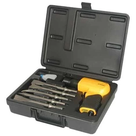 Coffret complet : 1 marteau-burineur, puissance 7 joules – Cadence de frappes 3.000 c/mn – Emmenchement hexagonal 10,2 mm – Poignée avec revêtement isolant – Avec 5 burins 175 mm (1 pointu, 1 plat, 1 coupe rivet, 2 découpe tôle), 3 ressorts et burette d’huile – Usage répétitif.