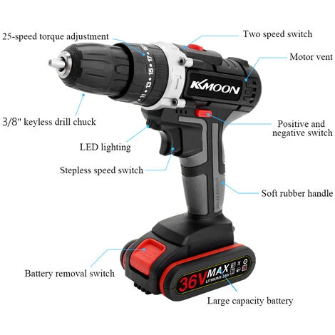 Cette perceuse électrique est équipée d’une batterie haute puissance, non limitée par des fils, la batterie est facile à installer et à démonter, facile à utiliser, facile à transporter, adaptée à la fois à un usage domestique et à l’extérieur.