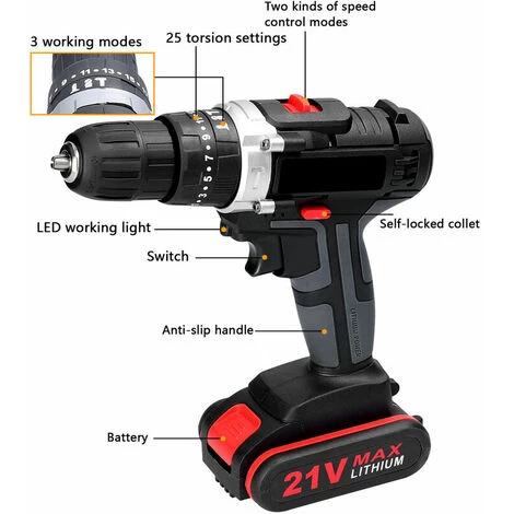 Multifonction, peut être utilisé comme perceuse à percussion (poinçonnage sur le mur, au sol), perceuse plate (percer des trous sur le métal, le PVC, les plastiques, le bois) et outil de vissage.