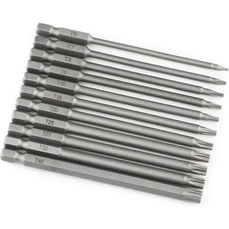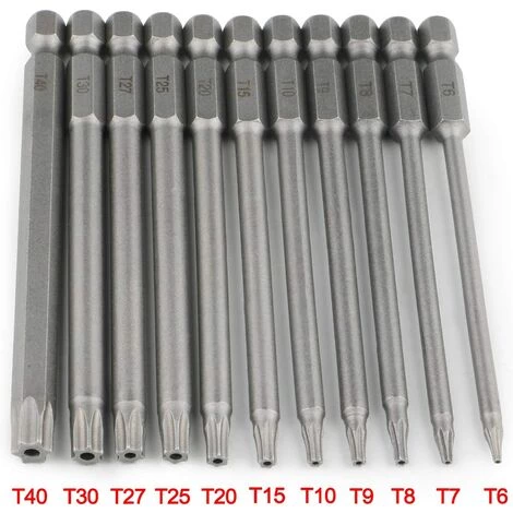 【Tige hexagonale T6-T40 de 100 mm de long】 Longueur de 10 cm, le design creux interne le rend plus économique. Il s’agit de tailles T6, T7, T8, T9, T10, T15, T20, T25, T27, T30, T40 pour répondre à vos différents besoins, compatible avec tournevis électrique, tournevis à main, perceuse à air, visseuse à percussion, etc.