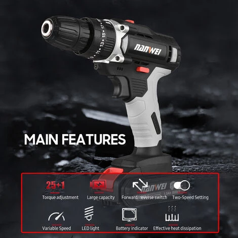 1. Deux modèles en option : NW-KEN-3E24-1 est une perceuse électrique ; Le NW-KEN-3E25-1 est multifonctionnel et peut être utilisé comme tournevis électrique pour visser des vis, perceuse électrique pour percer des trous et perceuse à percussion pour perforer le mur/le sol.