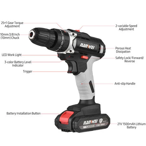 La perceuse électrique à main avec batterie au lithium rechargeable 21V 1500mAh et chargeur rapide est un outil pratique pour le perçage. Il est facile à utiliser et portable à transporter, et peut s’appliquer à la reconstruction de la maison, au bricolage, au travail du bois, au jardinage, à la réparation automobile et plus encore !