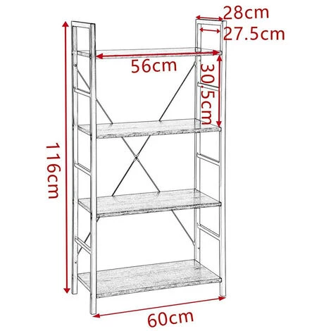 Dimensions: env. 60 × 28 × 116 cm (w x d x h) Dimensions de l’étagère: env. 56 × 27,5 cmdistance entre les étagères: env. 30,5 cmcolor des tubes en acier: étagère de couleur noire: Oaknumber léger des fichiers: 4Material: cadre en acier peint et mdf bandmax. Capacité de charge: 20 kg par compartiment