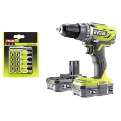 1x Pack RYOBI perceuse visseuse 18V OnePlus – 2 batteries 2.0Ah – chargeur rapide 2.0Ah R18DD3-220S – 21 accessoires de vissage RAK21MSD