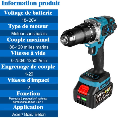 - Fonction : Perceuse à percussion, marteau perforateur, tournevis 3 en 1