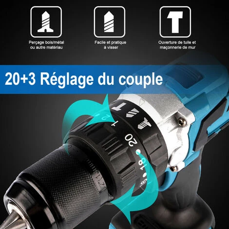 - – 20 + 3 réglages de phase, offre 20 réglages de couple et 3 modes de perçage pour un travail de haute précision.