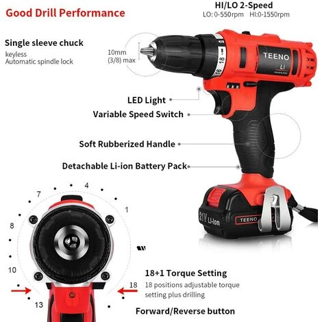 1. 【2 vitesses et embrayage 18 + 1】La perceuse-visseuse peut être réglée pour fonctionner dans deux plages de vitesse différentes. De plus, la perceuse dispose de 18 positions de couple parmi lesquelles choisir le mandrin, offrant un fonctionnement plus précis pour le perçage et le vissage.