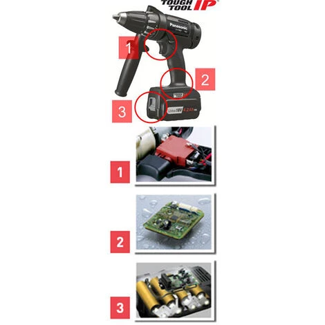 Même pendant les charges de travaux élevées, le moteur « 4-charbons » maintient la puissance sans perdre de la vitesse. Et cela en fournissant un fonctionnement continu. Le concept « Touch Tool IP » inclut des fonctionnalités telles que des capteurs qui surveillent les batteries. De plus il les protègent contre la surchauffe et les surcharges. Cette technologie assure un fonctionnement fiable, sûr et puissant pour l’utilisateur. 1: Interrupteur Augmentation de l’étanchéité pour une meilleure protection contre l’eau et la poussière. 2: Electronique Les circuits électroniques dans le panneau de commande et dans la batterie sont recouverts d’une couche d’uréthane pour garantir une protection accrue contre la poussière et l’eau. 3: Batterie Les cellules des batteries sont conçues pour éviter l’intrusion d’humidité. La perceuse visseuse sans fil PANASONIC 18V 5.0Ah Li-ion offre également 18 niveaux de couples + positions de perçages, un mandrin de serrage de 13mm (sans clé), un contrôle de vitesse électrique, un frein électrique, une lumière LED. Elle est vendue avec 2 batteries EY9L45B, un chargeur EY0L82B et une mallette de transport compact en polycarbonate. La gamme d’outils électroportatifs professionnels PANASONIC comporte :