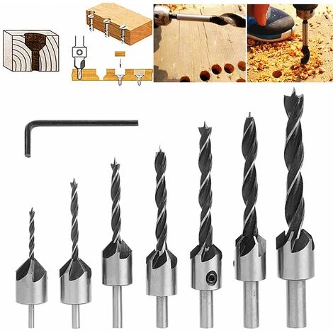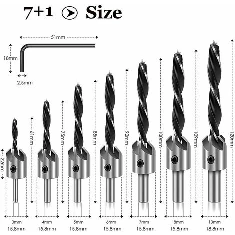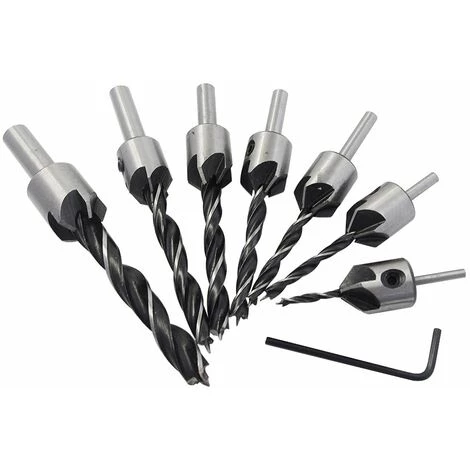 Sept pièces comprend des bits pour les trous de forage pilotes pour vis de tailles 3mm, 4mm, 5mm, 6mm, 7mm, 8mm, 10mm.