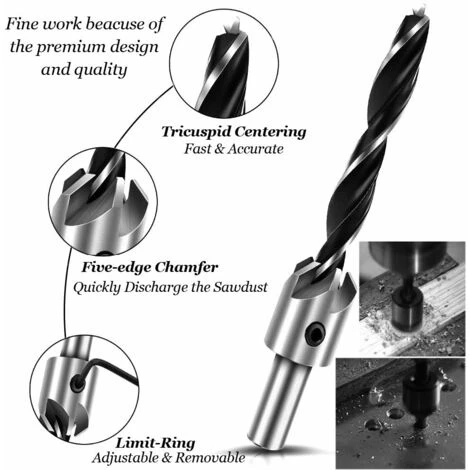 Chanfrein est de 5 flûtes, Dans le processus d’utilisation, peut décharger le bois plus rapide, trou de l’évier jetable percé lisse, bouchon à vis parfait noyé dans la surface de la pièce.