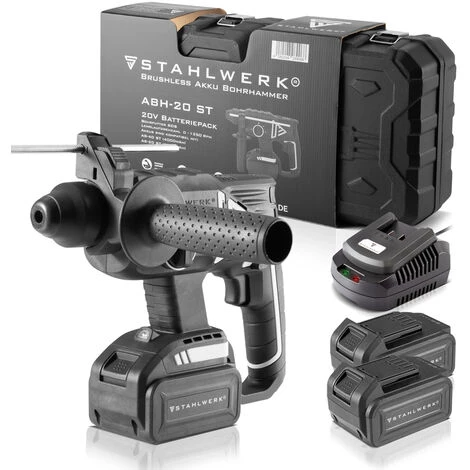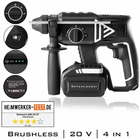 STAHLWERK Marteau perforateur sans fil 20 V ABH-20 ST, puissant et sans usure, vitesse de rotation de 0 – 1350 min-1, avec technologie Brushless, avec poignée ergonomique, batterie 4 Ah et chargeur inclus, avec 7 ans de garantie sur l’équipement et 2 ans de garantie sur les batteries!