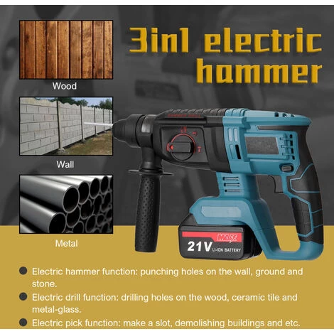 C’est une sorte de marteau électrique 3 en 1 de qualité, de conception multifonctionnelle, il peut être utilisé comme marteau électrique, perceuse électrique et pic électrique. Fonction marteau électrique: percer des trous sur le mur, le sol et la pierre. Fonction perceuse électrique: percer des trous sur le bois, les carreaux de céramique et le métal-verre. Fonction de sélection électrique: faire une fente, démolir des bâtiments, etc. Vous pouvez essayer.