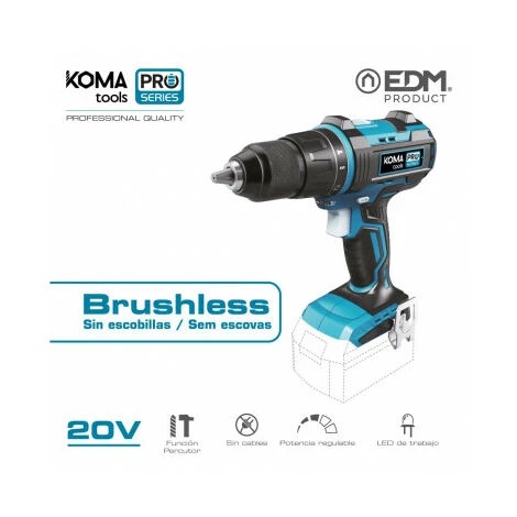 taladro percutor/atornillador de bateria li-ion brushless (sin escobillas) portabrocas ø13mm. no incluye bateria ni cargador. 2 velocidades variables (velocidad 1: de 0 a 500 rpm. velocidad 2: de 0 a 1800rpm). rotación izquierda/derecha. portabrocas sin llave de ø13mm. luz led para iluminar el punto de trabajo. soporte para colgar en el cinturon. 19 posiciones de apriete ajustable (max.50nm) + 1 posicion de taladro + 1 percutor. dimensiones: 22x25cm (fondo/alto) pro series battery koma tools