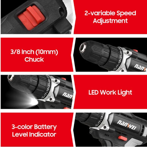 La perceuse Ă©lectrique portative avec batterie au lithium rechargeable de 1500 mAh et chargeur rapide est un outil pratique pour le forage. Elle est facile Ă utiliser et portable Ă transporter, et peut s’appliquer Ă la reconstruction domestique, au bricolage, au travail du bois, au jardinage, Ă la rĂ©paration automobile et plus encore !