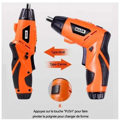 Voltage de batterie: 4.2 VPuissance nominale: 50WBatterie: batterie au lithium 1500mAhVitesse: 230RPMReglage du couple: 15+1Couple maximal: 6.0 nmDiametre de l’hexagone: 6.35 mmTemps de charge: environ 3HEclairage OLDE: OuiEclairage LED: OuiLampe de poche: OuiDouble deformation: Type Pistolet, Type PoigneeFonctions : vis autotaraudeuses, vis a tete plate, boulons et ecrous, percage du boisCaracteristiques: Transformation a un bouton 180¡ã a 90¡ãVous pouvez plier le tournevis comme vous en avez besoin. Appuyez sur le bouton ? PUSH ? sur le dessus pour faire pivoter le corps peut etre tordu et devenir droit. L¡¯arbre flexible vous aidera a atteindre les coins.Conception de la lampe de poche et lumiere LEDOffre une precision dans les zones faiblement eclairees. En cas de panne de courant inattendue, elle peut egalement etre utilisee comme eclairage de secours.Accessoires completsLa livraison comprend 1 * cable de chargement USB, 1 * boite en plastique, 28 * bits, 8 * manchon, 1 * tige d¡¯extension, 2 * perceuse, 4 * embout long, 1 * adaptateur de manchon, 1 * arbre a cardan.Instruction speciale en toute securite:Ne dechargez jamais completement la batterie.Verifiez que le courant disponible correspond au courant requis par le chargeur de batterie.Ne laissez jamais l¡¯humidite, la pluie ou les eclaboussures d¡¯eau atteindre l¡¯emplacement de charge.Ne chargez pas votre batterie lorsque la temperature est inferieure a -10¡æ (+40¡æ) ou superieure a -40¡ãF (+105)¡ãF.