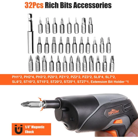 Phillips et type d’embouts à tête plate : PH1*2, PH2*4, PH3*2, PZ0*2, PZ1*2, PZ2*2, PZ3*2, SL8*4, SL7*2,SL6*2, ST10*2 , ST15 * 2, ST20 * 2, ST25 * 1, ST27 * 1, porte-embout d’extension * 1″