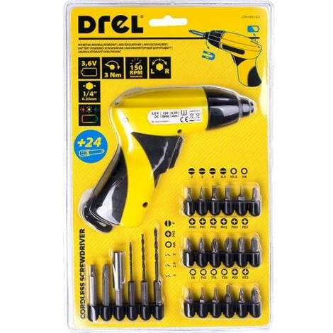 Tournevis sans fil Tournevis Tournevis 24 x embouts_x000D_Tournevis à batterie 3,6 V, 24 bits_x000D_Un petit tournevis sans fil pratique pour les travaux ménagers légers._x000D_L’ensemble comprend jusqu’à 24 éléments: 3 forets, une extension et 20 bits._x000D_Le tournevis a un indicateur de niveau de batterie._x000D_DESCRIPTION DU PRODUIT:_x000D_Tension de la batterie: 3,6 V_x000D_Vitesse de rotation: 0-150 tr / min_x000D_Couple maximum: 3 Nm_x000D_Capacité de la batterie: 1,3 Ah_x000D_Batterie: Lithium-ion_x000D_Temps de charge: 3-5 heures_x000D_Tension du chargeur: 220-230 V_x000D_L’ensemble comprend des embouts 24 pcs._x000D_Emballage: blister_x000D_Outils, outils de serrurier