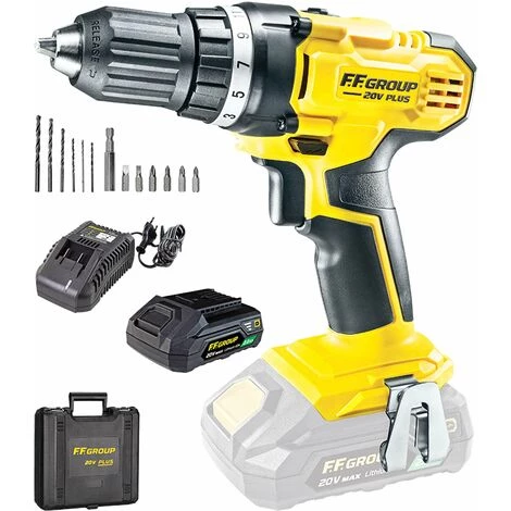 La visseuse FFgroup CDD/35 20V à vitesse variable et avec un kit de démarrage comprenant une batterie et un chargeur.