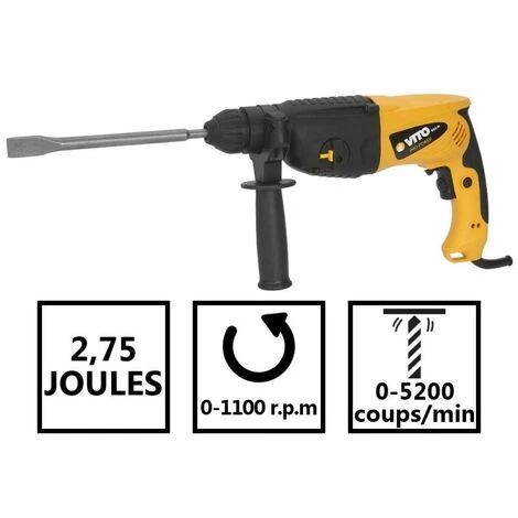 Le marteau piqueur perforateur VIMP850 de VITO délivre une puissance de 850W. Il développe une force de frappe de 2.75 Joule pour donner jusqu’à 5200 coups/min. Sa vitesse de rotation varie de 0 jusqu’à 1100 tr/min. Cet appareil est équipé d’un embrayage de sécurité et il possède plusieurs mode de perçage et percussion. SDS +