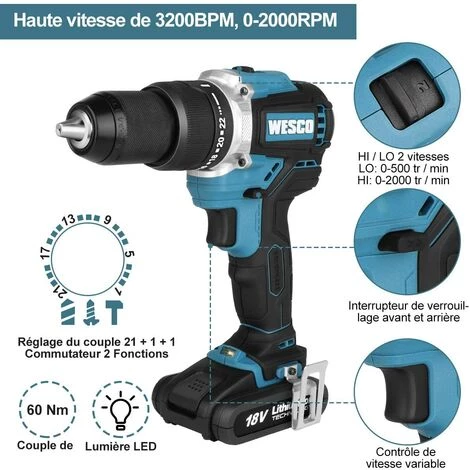 22 + 1 + 1 niveaux de couple – fonctionne pour vous comme une perceuse, un tournevis sans fil et un marteau compact. 2 modes de perçage et 2 vitesses: basse vitesse (0-500 tr / min) pour les tournevis, haute vitesse (0-2000 tr / min) pour le perçage.