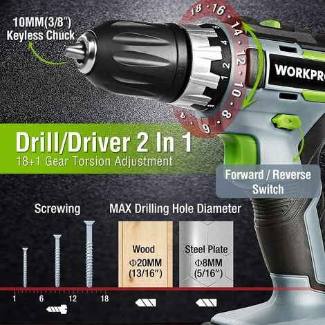 ⚒【Perceuse Visseuse 25Nm】Cette perceuse visseuse 20V efficace dispose de 18+1 niveaux de couple et de 2 positions (vis, perçage). Il offre des opérations à 2 vitesses: 0-360 tr/min et 0-1300 tr/min qui convient à diverses travaux de perçage et de vissage. Le mandrin auto-bloquant de 10mm rend le remplacement des accessoires plus pratique et facile